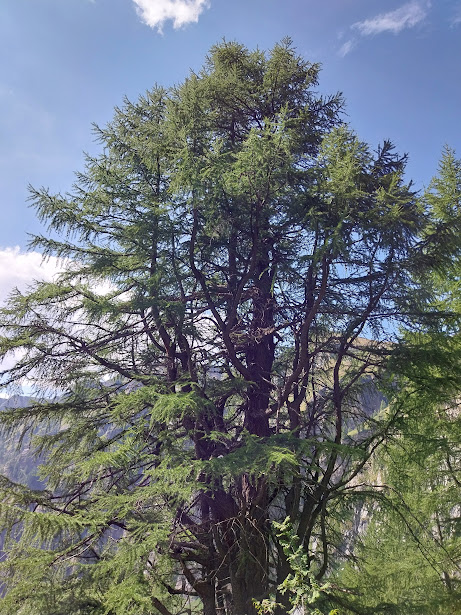 Un altro giovedì in Paradiso, nonostante i nostri peccati. A Corte Verde una freccia rossa su un sasso e la scritta “Nava” ci ingannano. Teniamo la destra seguendo un sentierino che, più in alto, si perde in uno splendido e ripido bosco di larici. Dopo rapide consultazioni prevale la saggezza della nostra età media elevata (escluse naturalmente le badanti) e torniamo a Corte Verde. Abbiamo perso quasi un’ora, ma in questa meravigliosa giornata va bene anche un approfondimento delle nostre conoscenze di un territorio nuovo e di grande bellezza.