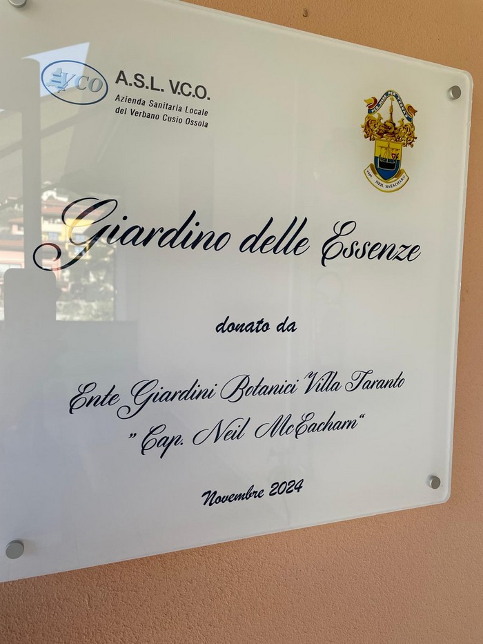 VERBANIA - 13-11-2024 -- È nel ricordo del capitano Neil McEachern, che sessant’anni fa fece lo stesso con l’ospedale di Verbania, che la direzione dell’Ente giardini botanici Villa Taranto ha voluto omaggiare del “Giardino delle essenze” l’Asl Vco e l’Hospice all’ex ospedale San Rocco di Intra. In una struttura per cure palliative che tratta pazienti terminali è stato creato un giardino pensile che, all’interno di cinque cassoni e con un ricambio stagionale di essenze, porterà un po’ di bello in quel luogo. Il giardino è stato collocato sul terrazzo. Nel primo allestimento sono state messe a dimora piante aromatiche come rosmarino e salvia, ma anche ricino e zinnie.