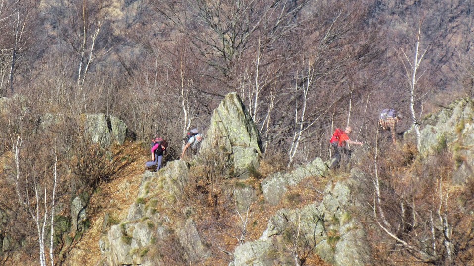 Breve pausa con bellissimo panorama a sud verso i laghi (Maggiore, Varese, Monate) e a nord verso i monti dell'alta Val Grande. Di qui in su non ci si guarda più in giro, se non per cercare i segni circolari rossi che indicano il percorso. Li troviamo poco dopo, grazie ad un amico già salito di qui anni fa', nel bosco ripido e “sporco” sopra l'alpe e li seguiamo con attenzione. Ci conducono sulla dorsale (il filo) che sale verso il Todum in direzione nord – est. Un traverso molto ripido e leggermente esposto nel bosco è il punto più delicato dell'escursione.